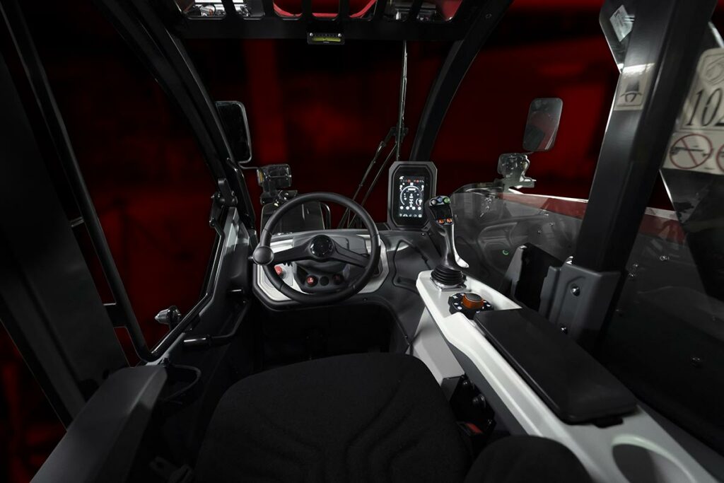 לוח מחוונים טכנולוגי במיוחד עם בקרות הממוקמות בצורה אינטואיטיבית ומאורגנות לפי היגיון פונקציונלי. בתחום הבטיחות, התא עומד בתקנים האירופיים ROPS ו-FOPS ובתקן ANSI האמריקאי, תוך שמירה קפדנית על החקיקה העדכנית.